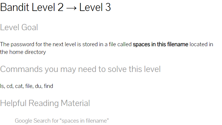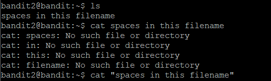 ls 명령어로 확인해보면 문제의 설명처럼 패스워드가 포함되어 있는 spaces in this filename 이라는 파일이 보인다.